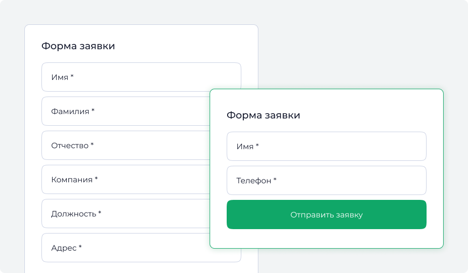 Самая распространённая проблема. Бизнес хочет получить максимум информации сразу: имя, фамилию, отчество, должность, компанию, телефон, e-mail, бюджет, комментарий. Логика владельца понятна — менеджеру удобно работать с полным профилем клиента. Но для посетителя каждое лишнее поле — это дополнительное усилие и повод закрыть вкладку.