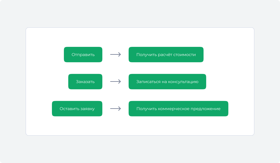 «Отправить», «Заказать», «Оставить заявку» — стандартные формулировки, которые ничего не говорят посетителю о том, что произойдёт после нажатия. Получит ли он расчёт? Звонок менеджера? Документ на почту? Отписку «мы перезвоним» через два дня?