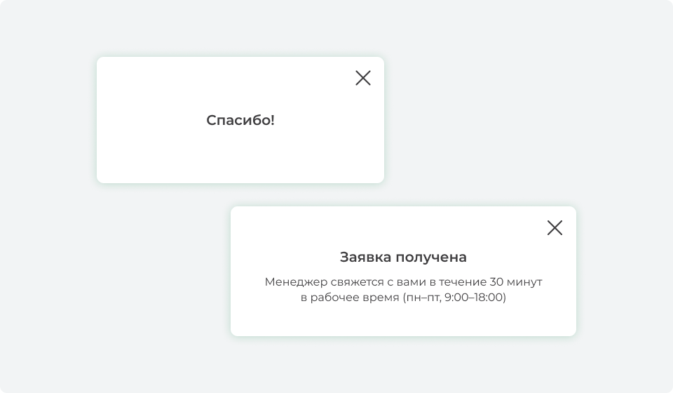 - Подтверждение, что заявка ушла. Не просто «Спасибо», а «Заявка получена. Номер обращения 1247».